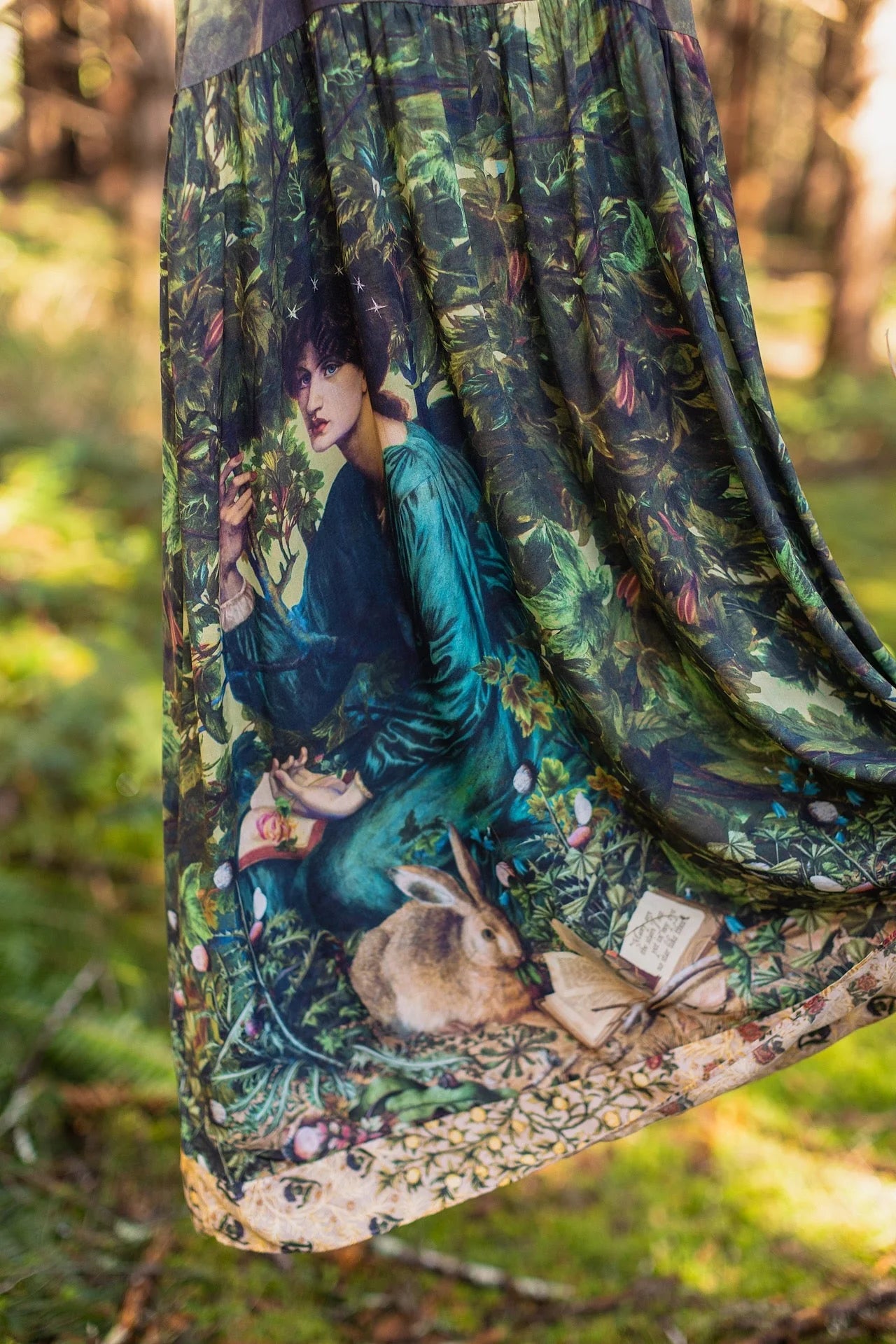 Meaning “Beautiful Night”, Bella Notte dress is a romantic dream. Featuring Rossetti’s dreamy 1880 muse, a charming rabbit from the 1500s, a moonlit river, and a William Morris floral trim, it’s a starry mix of art and magic. ✨ The bodice even carries the words: “Many are the stars I see, yet in my eye no star like thee.”