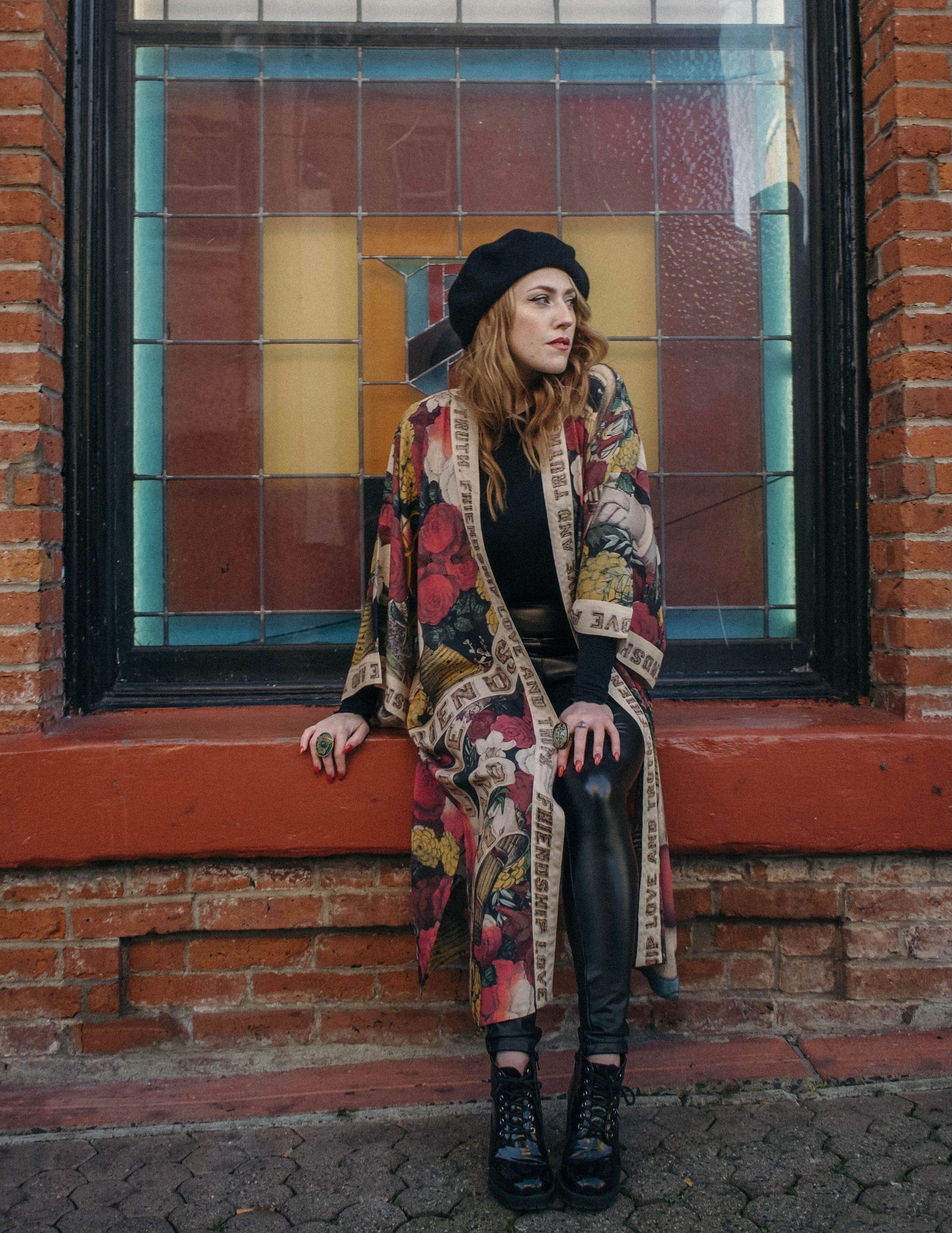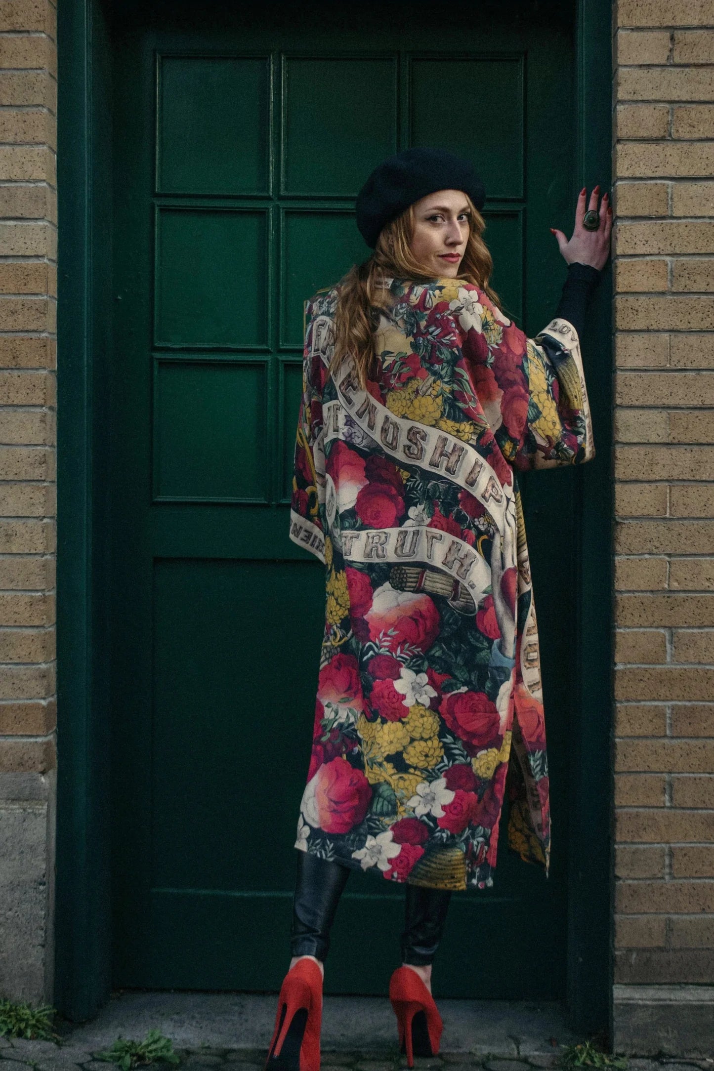 It takes a bold heart to live your truth. To keep reminding yourself that love is the answer, even on your hard days! We created this eclectic, super cool opera-length kimono from an 1880s print unearthed in a library archive, and adapted the utterly charming wood-grain lettering to build the trim. The result is one of our favorite pieces in the collection: beautiful and completely unique, with a lot of romance, and a touch of rock and roll. There are so many delightful images on this duster, all of which are historic symbols of friendship, love, and truth!